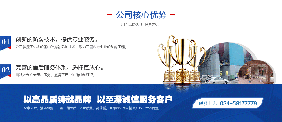 2004;GB/T28001-2011/OHSAS18001:2007;GB/T19001-2008/ISO9001:2008認(rèn)證 體系,取得了化工防腐蝕施工資質(zhì)等級一級單位,遼寧省腐蝕與防護(hù)學(xué)會防腐施工專業(yè)委員 會主任委員會主任委員單位,是中國石油撫順石油化工公司網(wǎng)內(nèi)成員單位。幾年來本著“客 戶為尊、精益求精”的服務(wù)宗旨,服務(wù)于基礎(chǔ)設(shè)施、石油、化工、治金、化纖、能源、礦山、 核電站、海洋工程等眾多行業(yè)企業(yè)。 ![]() ![]() ![]() ![]() |